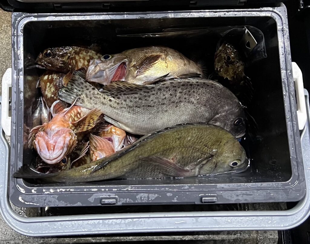 暗くなって来てからカサゴ中心にポツポツ上がり始めて来たがリリースサイズも多かったです。キープサイズの釣果です。