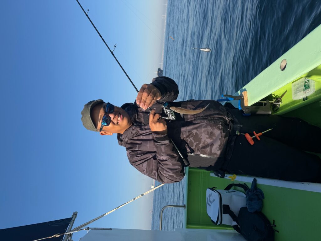 海上はベタ凪で潮流れ緩慢も良型交じりにポツポツ当たりました。2番手102尾。